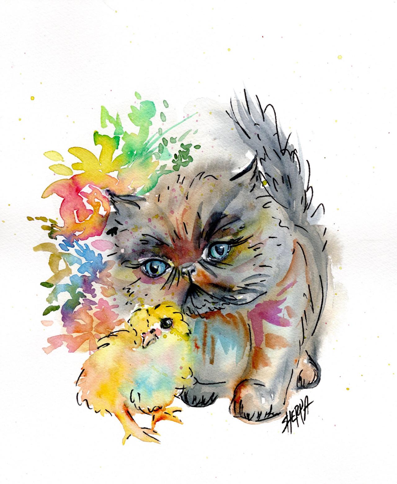 Sherpa Stash Sale - Adorable Kitten and Chick watercolor painting