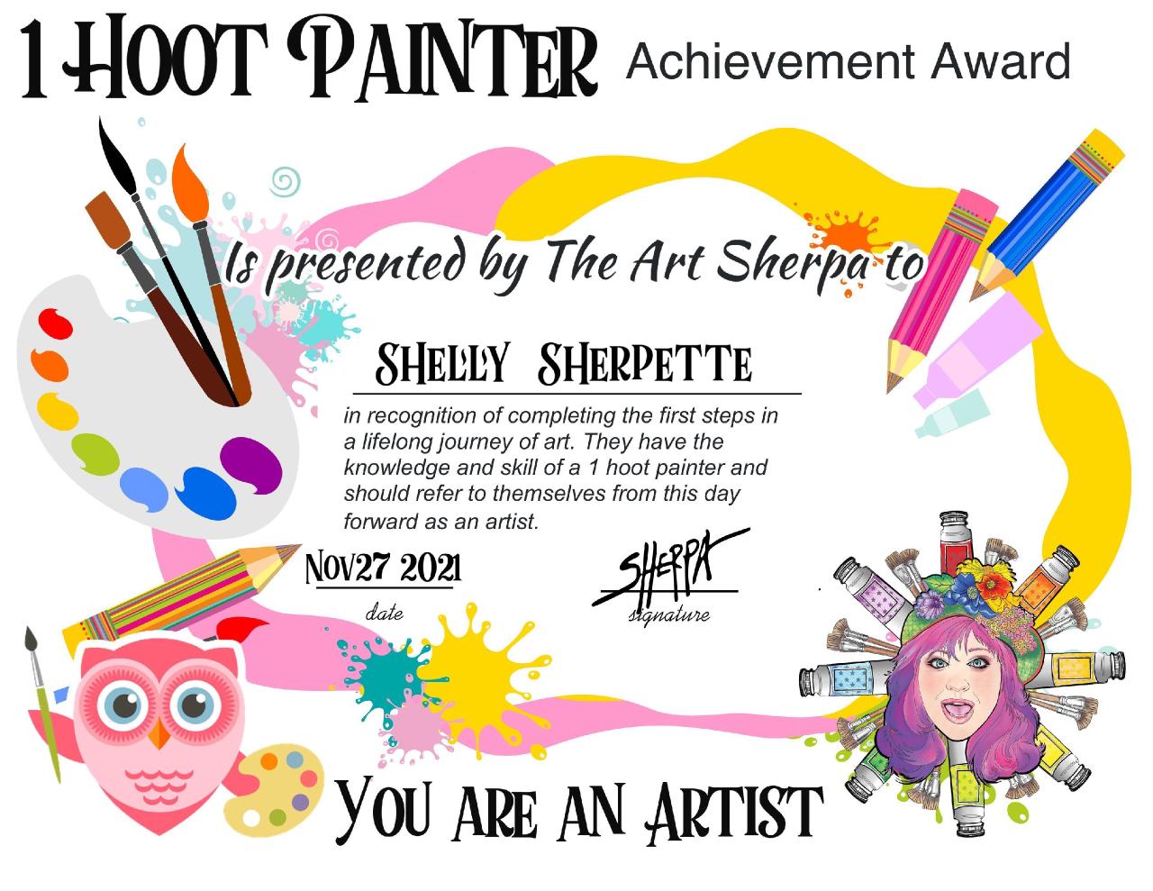 The Art Sherpa Hand Signed One Hoot Painter Achievement Award. This certificate is printed on quality paper by us and hand signed (not a printed signature) by The Art Sherpa herself. It also comes a beautiful Art Sherpa enamel pin to to wear or display to celebrate you achievement. Get one of our hand signed certificate awards to show off your hard work and your rights to now claim "I am an Artist."