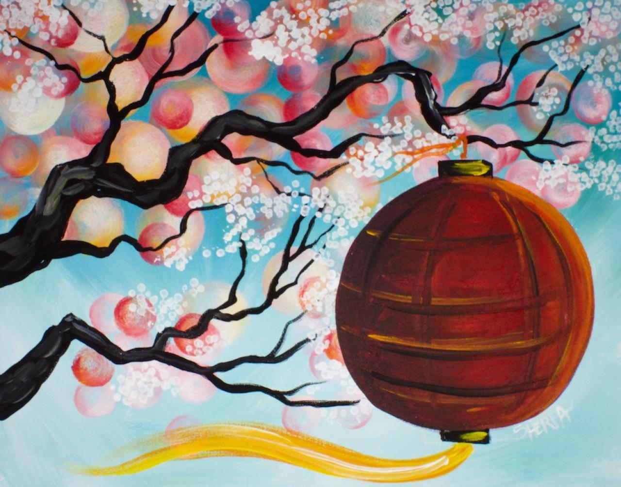 • Cherry Blossom Branch with red lantern Acrylic Painting The Art Sherpa  Q-tip
