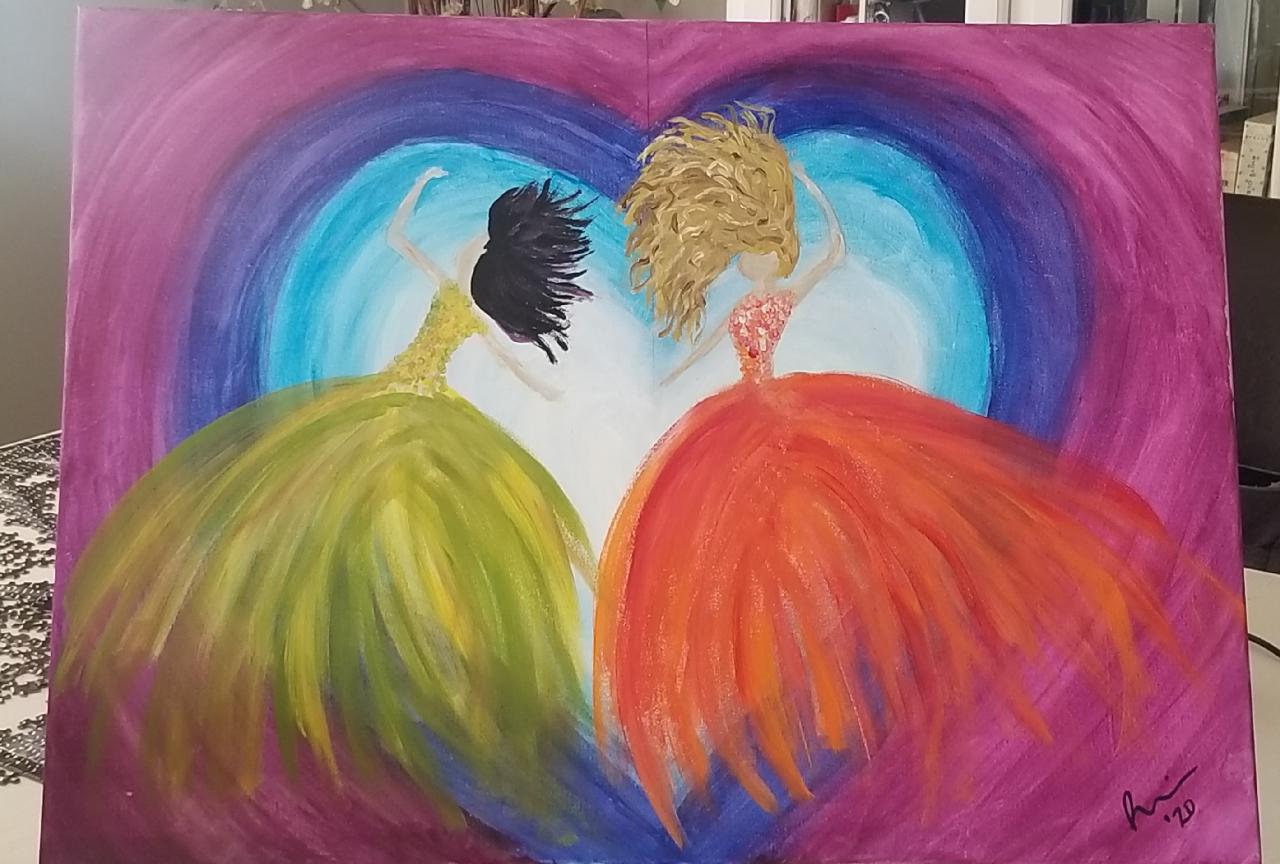 Sisters Dancing is a magical Beginner painting lesson. This simple double canvas paint along can be done as one canvas or as a couple paint nite date night.