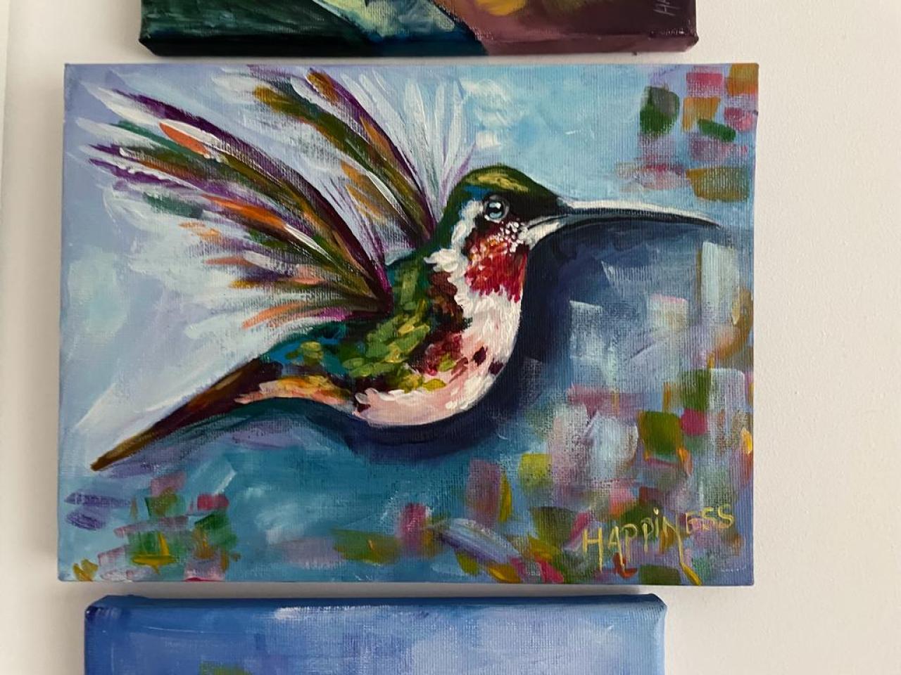 HUMMINGBIRD IN FLIGHT THIS IS A Easy social paint night in you can enjoy from the comfort of your own home keeping it fun. Create 6 little matching bird paintings in just 1 day ! YOU CAN PAINT THIS !! All Art lessons are brought to you by The Art Sherpa 🎨 👩🎤 You can join our Live stream chats daily to connect with other painters just like you.