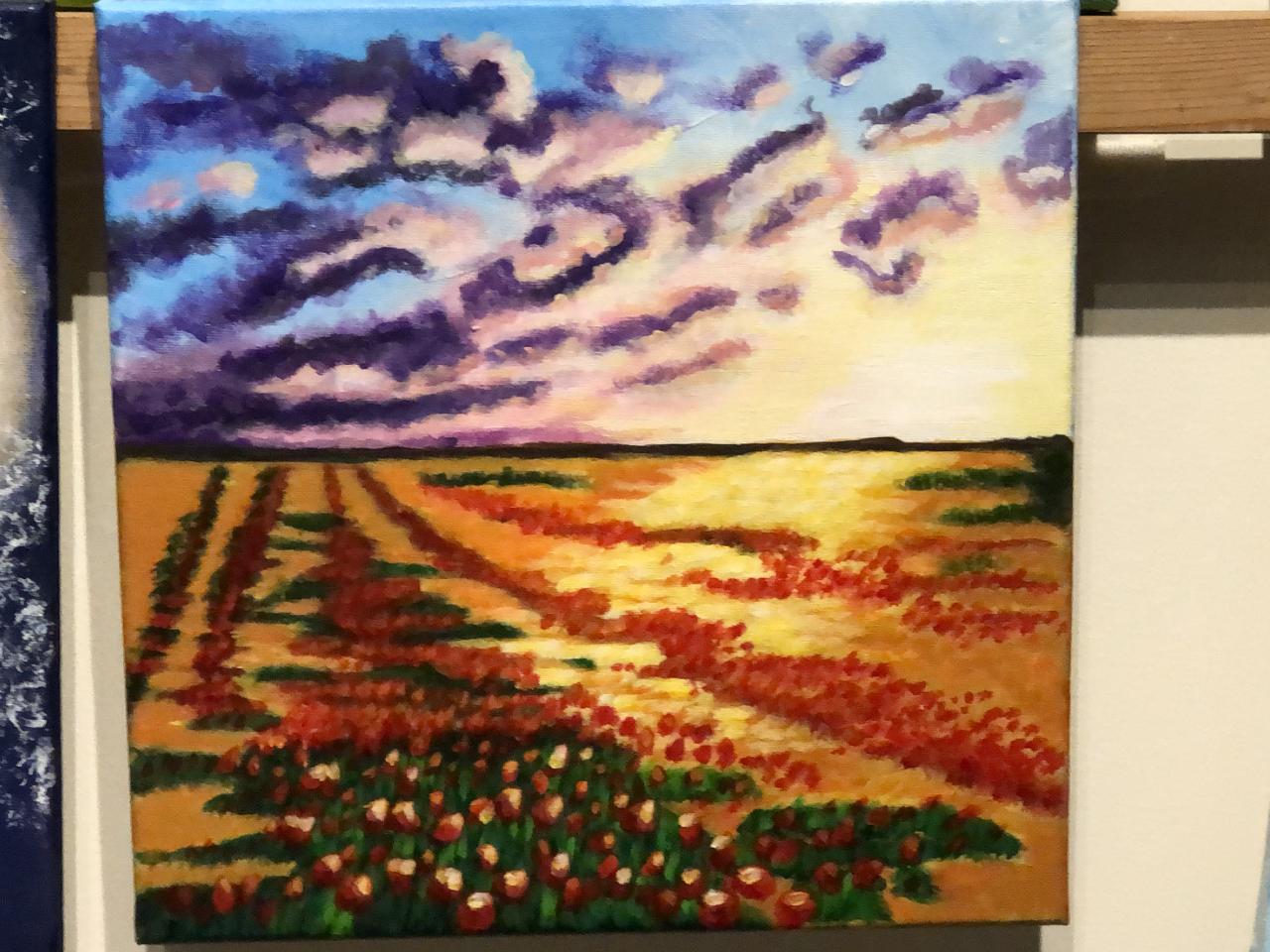 getting the colour mixes just so was challenging; and sometimes the lights blur the colours together- particularly when the sun is mostly white and there is very little yellow around it! I took most of about 3-4 hours to finish this- I was having trouble with my hogs and getting the same effects as Cinnamon. It was challenging and I think I ended up with a field of tulips- but it is finished!! and my clouds are improving- still have along way to go! hope everyone else is having fun too! See you at an easel tomorrow!