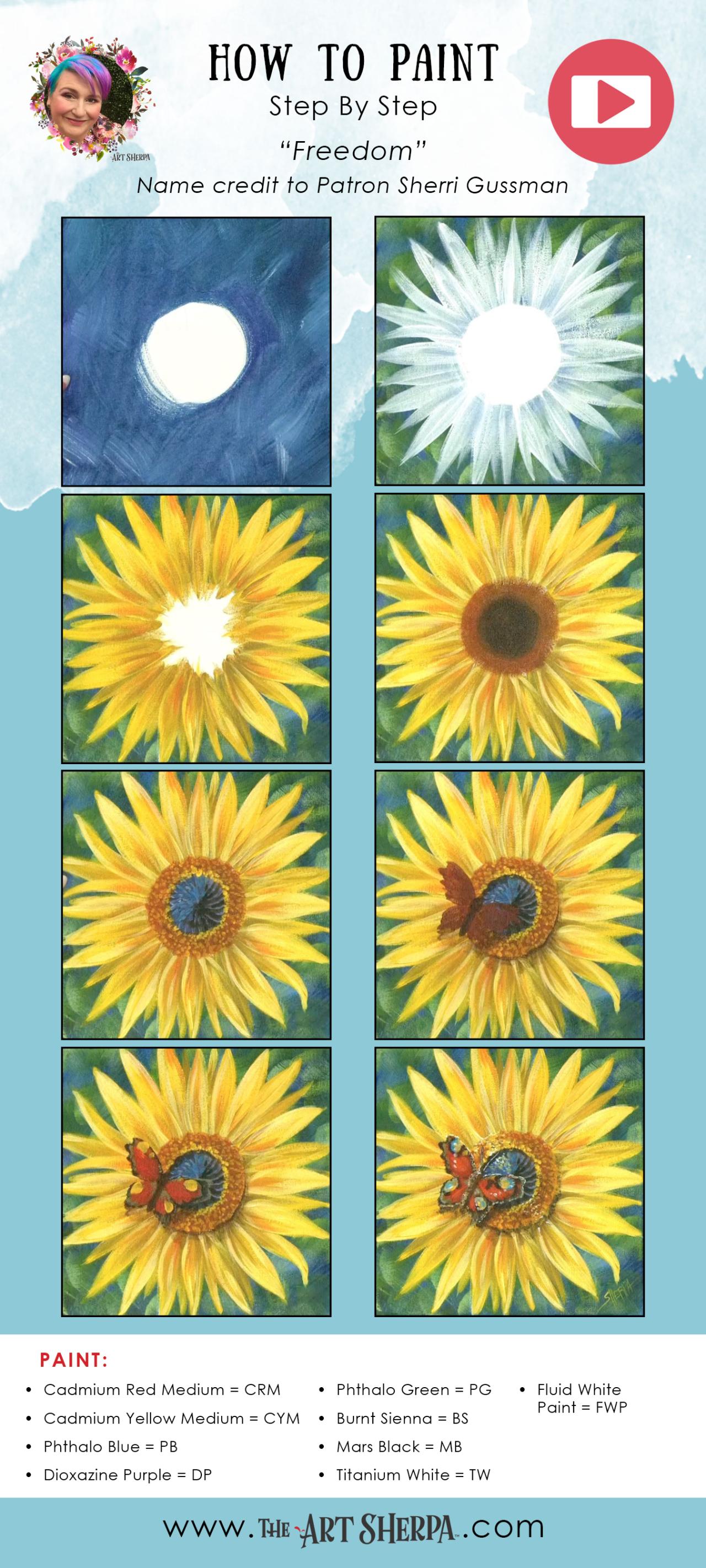 Sunflower and Butterfly Easy Acrylic Tutorial Step by Step Day 5 #AcrylicApril BLOOM How to paint Flowers by The Art Sherpa This is the first Daily Painting course for Beginners who want a real acrylic painting step by step tutorial about how to paint better Flowers. Everything is 100% real time, multi Camera angles and fully explained so it's easy to understand. YOU CAN PAINT THIS !! All Art lessons are brought to you by The Art Sherpa You can join our Live stream chats daily to connect with other painters just like you.