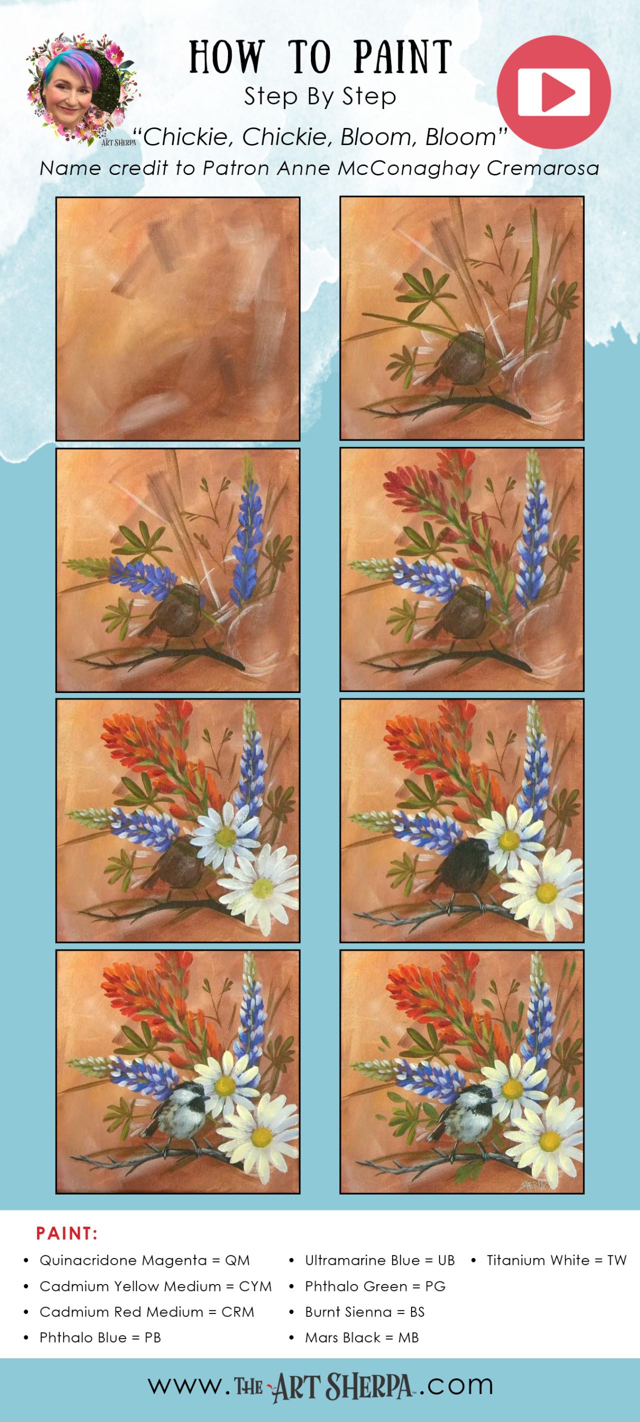 Bluebonnet Wildflower Chickadee 🌺🌸🌼 Easy Acrylic Tutorial Step by Step Day 9 #AcrylicApril 🌺🌸🌼 BLOOM How to paint Flowers by The Art Sherpa This is the first Daily Painting course for Beginners who want a real acrylic painting step by step tutorial about how to paint better Flowers. Everything is 100% real time, multi Camera angles and fully explained so it's easy to understand. YOU CAN PAINT THIS !! All Art lessons are brought to you by The Art Sherpa You can join our Live stream chats daily to connect with other painters just like you.