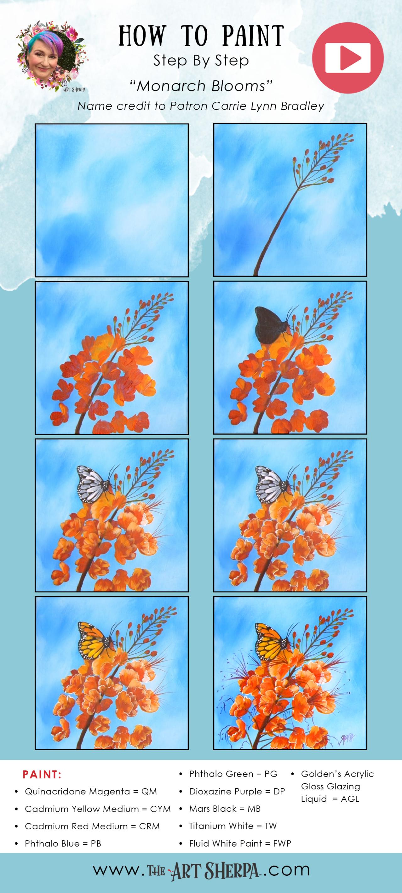 Flower and Monarch butterfly Easy Acrylic Tutorial Step by Step Day 22 #AcrylicApril BLOOM How to paint Flowers by The Art Sherpa This is the first Daily Painting course for Beginners who want a real acrylic painting step by step tutorial about how to paint better Flowers. Everything is 100% real time, multi Camera angles and fully explained so it's easy to understand. YOU CAN PAINT THIS !! All Art lessons are brought to you by The Art Sherpa You can join our Live stream chats daily to connect with other painters just like you.