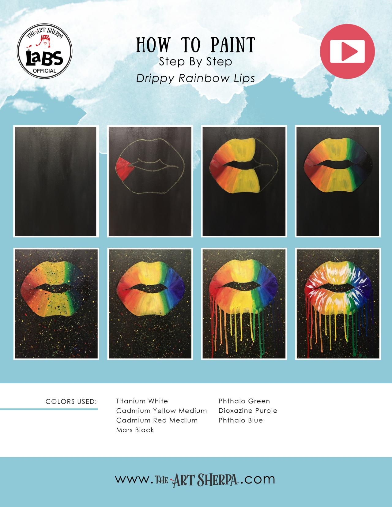 Beginners learn to paint full acrylic art lesson of Rainbow dripping Lips #LisaFrankInspired is a YouTube Collaboration where artists come together to create projects inspired by artist Lisa Frank. Coordinator: Shae206 Playlist: https://www.youtube.com/playlist?list=PLrv8ceZtpT1nGgXnIPEAD_o06itjuUUAV Lisa Frank is a name all 80's and 90s children grew up loving! From Rainbows to unicorns, dolphins to painting pandas, the Lisa Frank brand had a huge part in our back to school lives! Now, Lisa Frank and Glamour Dolls have teamed up to launch Lisa Franks first adult make-up line that is set to release in April 2017!! It is sure to be a magical flashback to our childhood for many of us. Below are a list of materials. The links go through our Amazon Affiliate program, and you support The Art Sherpa when using them. These are link to make thing easy and convenient. *** Acrylic Paint Colors ***