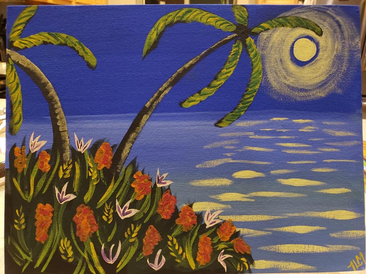 This was my 10 paint with you, and it was fun! I painted this one in anticipation of going to Hawaii in 3 weeks! I enjoyed it. Surprisingly, the palm fronds were harder than I expected.