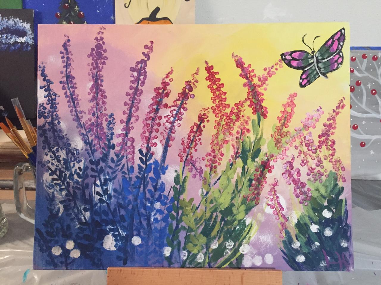 Simple Beginners learn to paint full acrylic art lesson using fun acrylic techniques to create this lavender and butterfly scene. Using cotton swabs, sponges and crumpled plastic film you can create this at home.
