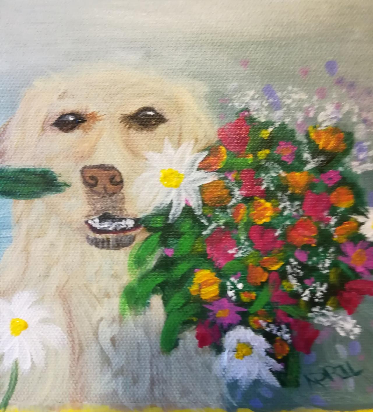 Golden Retriever puppy in wild flowers beginner Acrylic on canvas Step by step daily Live streaming painting from word prompt: Secret Garden