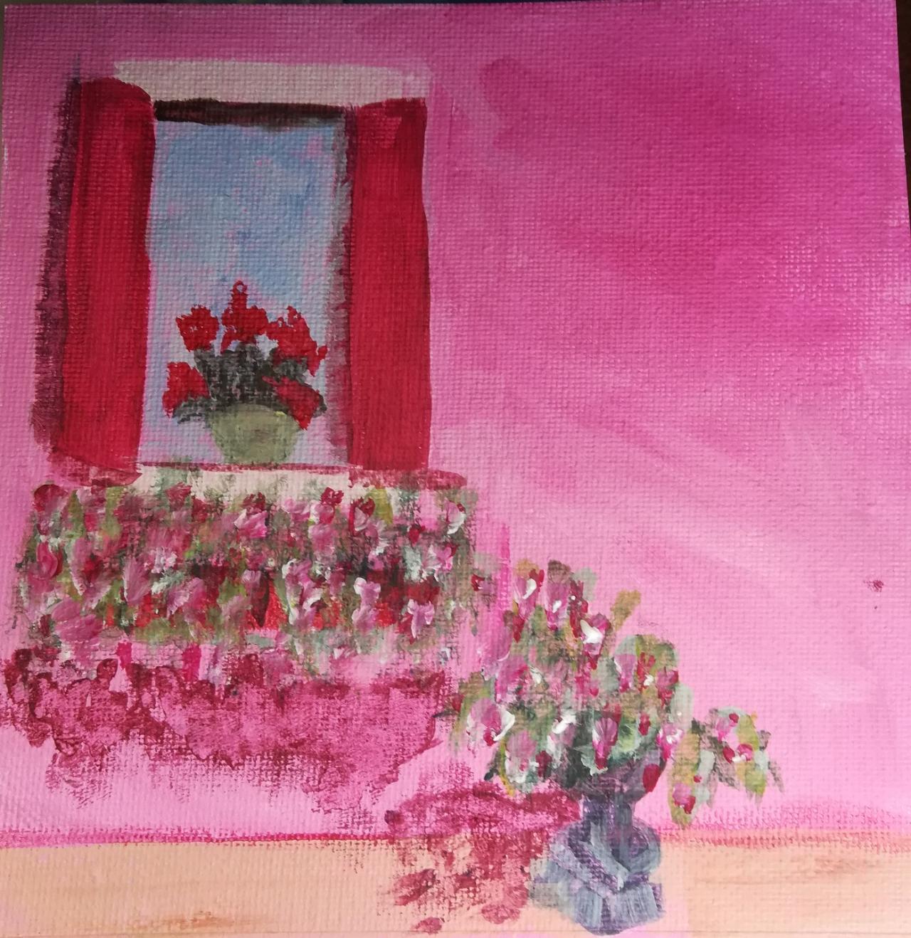 Pink colored window with flowers beginner Acrylic on canvas Step by step daily Live streaming painting from